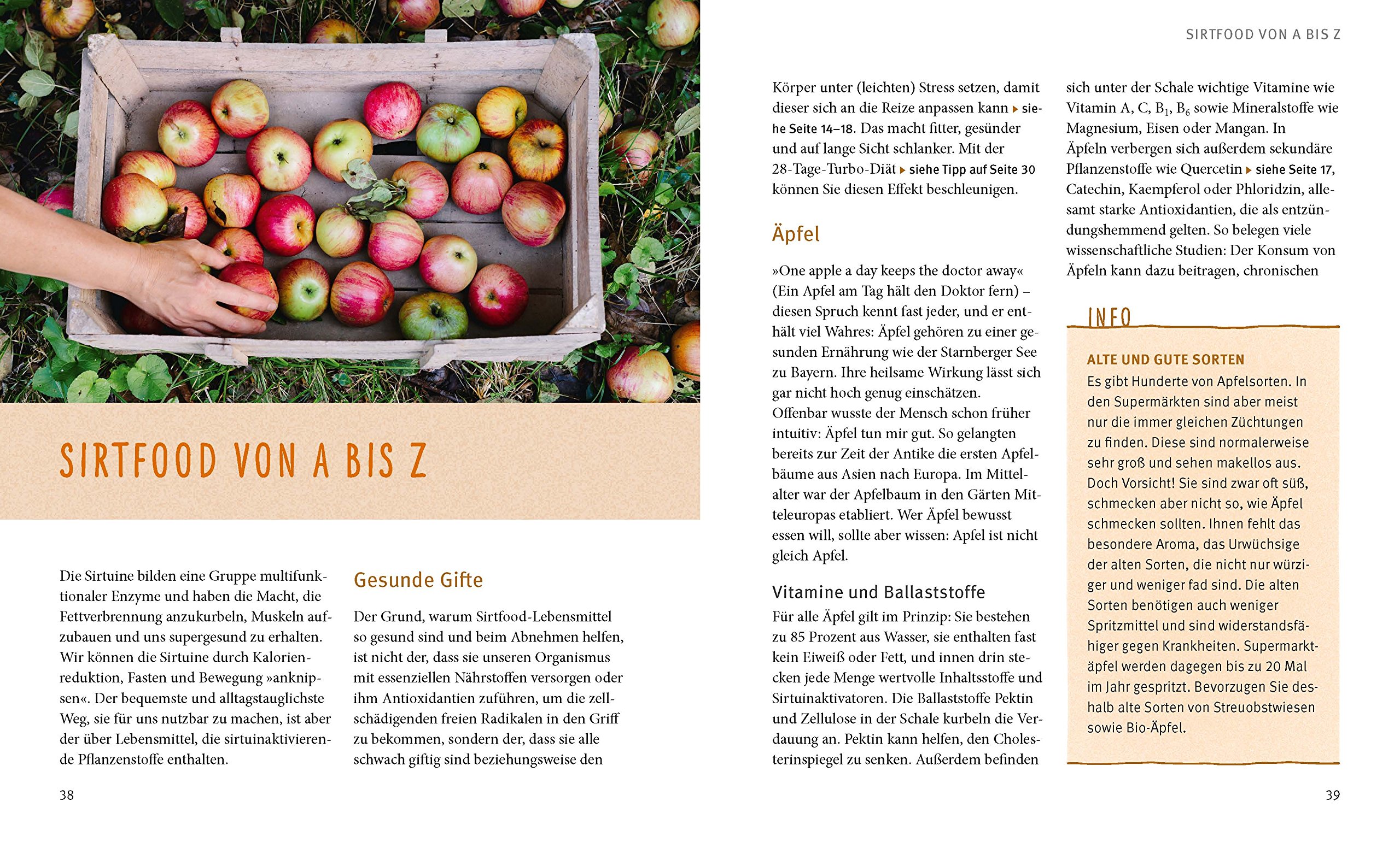 - Praxis: Sirtfood-Lebensmittel von A wie Äpfel bis Z wie Zwiebeln und Sirtfood-Diät-Rezepte für das 2-Wochen-Programm: Vom Frühstück (z.B. „Buchweizen-Porridge mit Orangenkompott“) übers Mittagessen (z.B. „Putenbrust-Wraps mit Currycreme“) bis zum Abendessen (z.B. „Gemüse-Oliven-Tortilla) – diese Sirtfood-Diät-Rezepte machen Sie schlanker und jünger.